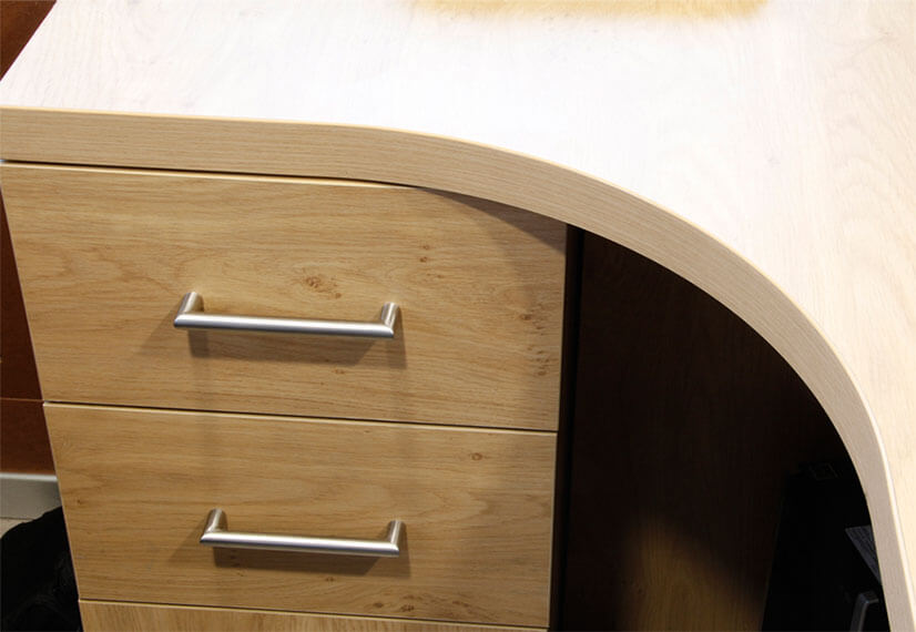 Nos centres d'usinage HOMAG sont équipés d'une unité d'encollage de bande de chant. Nous sommes ainsi capables de réaliser des plans de travail, plateaux, éléments d'agencements de forme courbe :