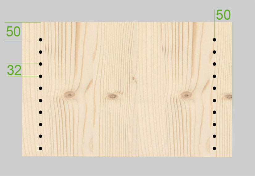 Perçage entraxe 32 mm pour fixation d'étagère mobile.